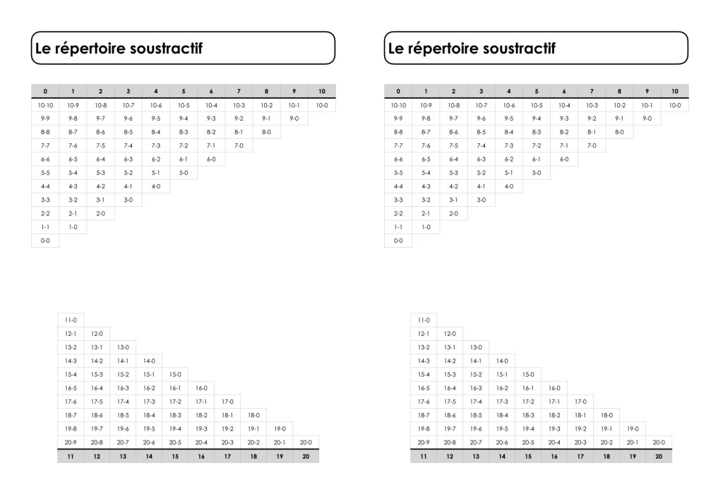 Pour révision ou cahier, on trouve partout le répertoire additif et jamais le soustractif, voilà chose faite.