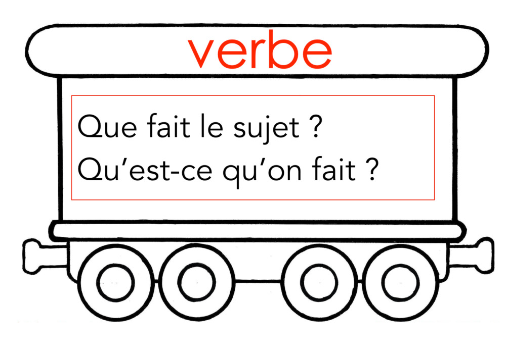 Affiches de trains/wagons au sujet des fonctions grammaticales : sujet, verbe, complément de verbe direct et indirect, complément de phrase et attribut du sujet.