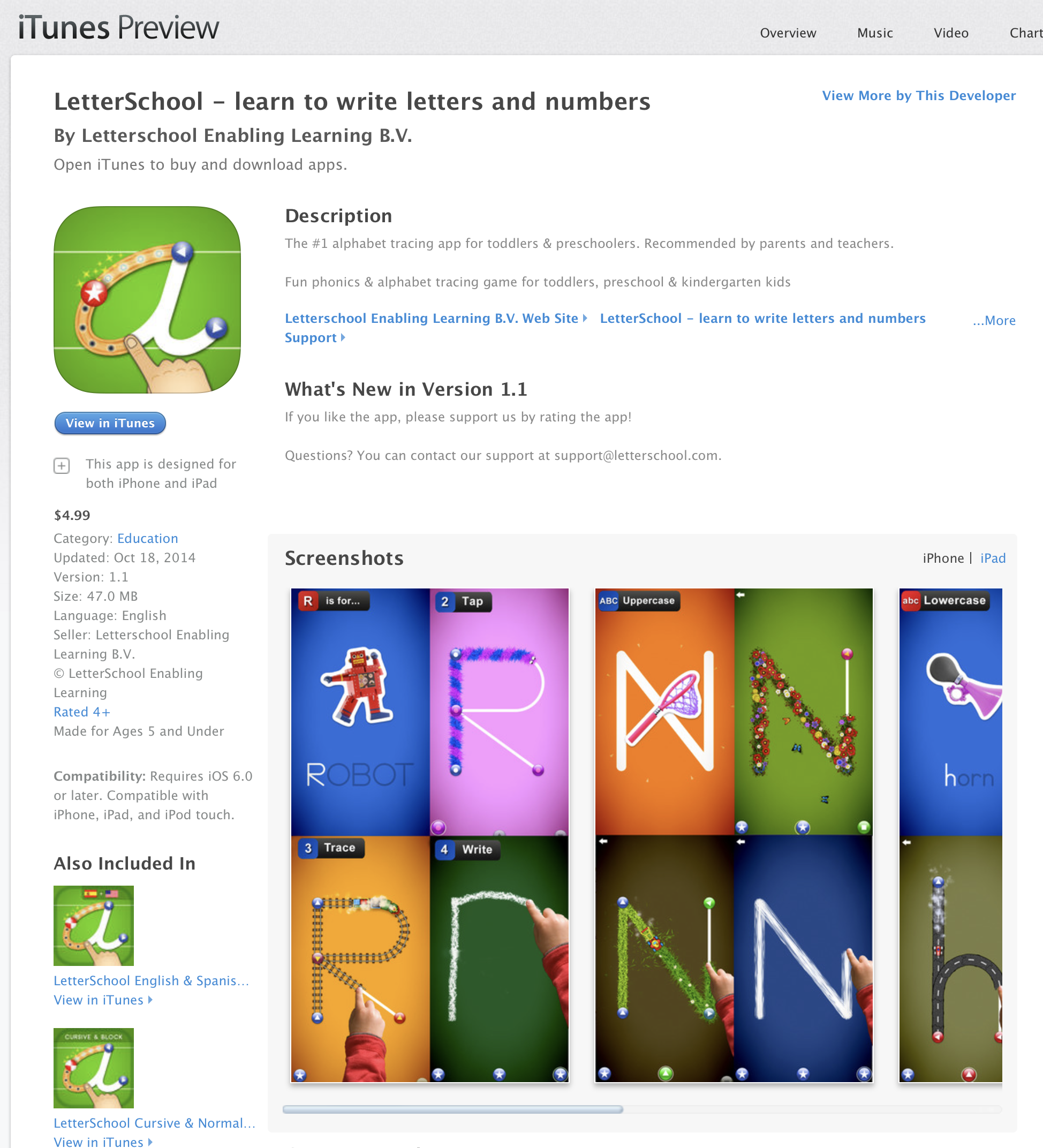 Jeu à télécharger sur iPad ou smartphone, malheureusement payant, mais cela en vaut la peine. Voici une démo sur Youtube, ce logiciel est idéal pour travailler la motricité fine et l'apprentissage de la caligraphie des lettres. https://www.youtube.com/watch?v=4sDZqBMqG-4Lire la suite