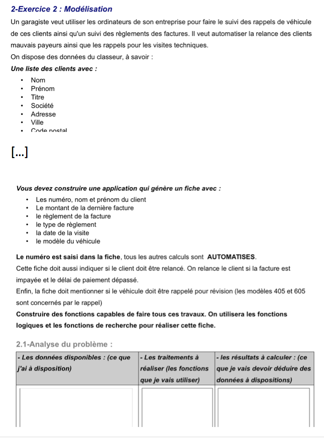 Mise en situation avec le Tableur de LibreOffice Créé par Anthony Taubin pour ses élèves « Un garagiste veut utiliser les ordinateurs de son entreprise pour faire le suivi des rappels de véhicule de ces clients ainsi qu'un suivi des règlements des factures. Il veut automatiser la relance des (...)Lire la suite